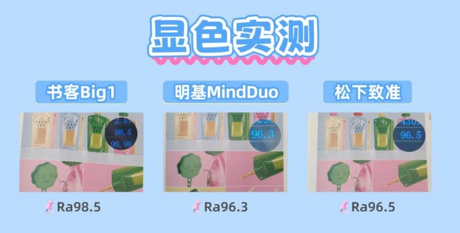 松下致准(Ra96.5)和明基MindDuo(Ra96.3)均达到了Ra95以上的优良水平,满足日常读写、看黑白课本基本没有压力。但在对比高饱和度的彩色画面时,能感觉到松下致准下的颜色略显沉稳(稍暗),而明基MindDuo下的画面则有一点“蒙灰”感,色彩的鲜活度和通透感稍逊一筹。