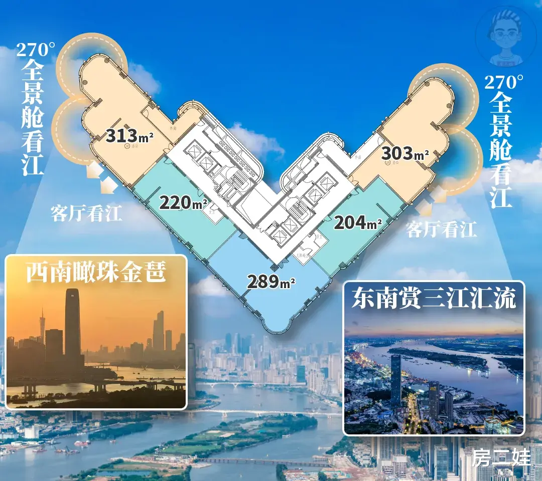 建面约298㎡户型,就更牛了,既有270°全景舱的“珠金琶”景观,同时东南又能看三江汇流浩瀚江景,简直太绝了。