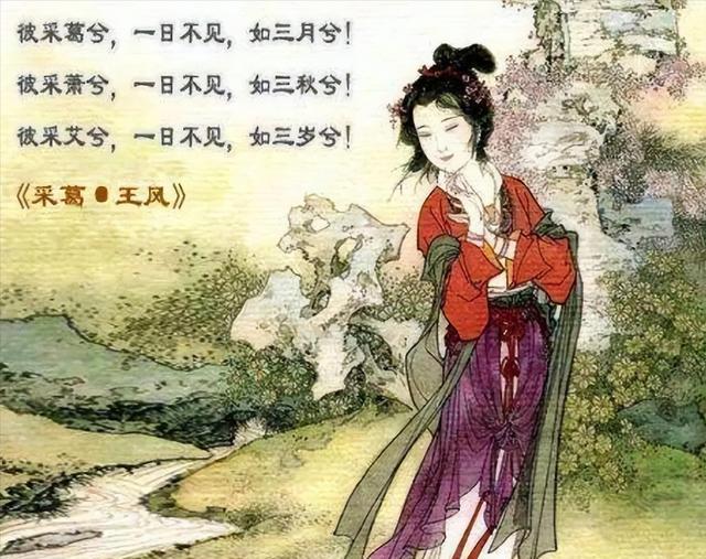 《诗经·王风·采葛》里说,那人去采葛草了,一天没见,感觉像过了三个月。那人去采艾蒿了,一天没见,仿佛隔了三个秋天。那人去采艾草了,一天没见,就像过了三年一样漫长。