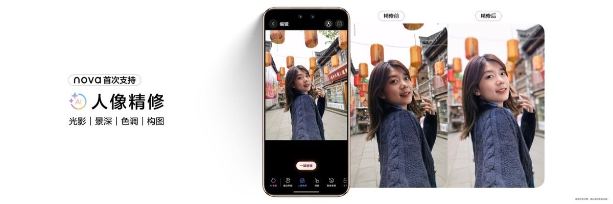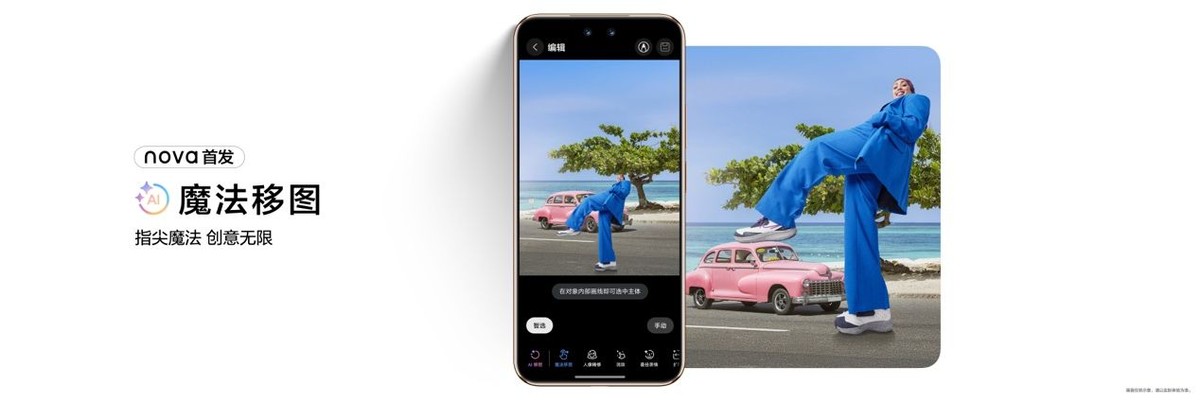 如果说硬件决定了成像的上限,那么AI功能则拓展了创意的边界。华为nova 14系列搭载的AI修图2.0功能,让用户仅需简单操作,就能完成高质量的创意修图。
