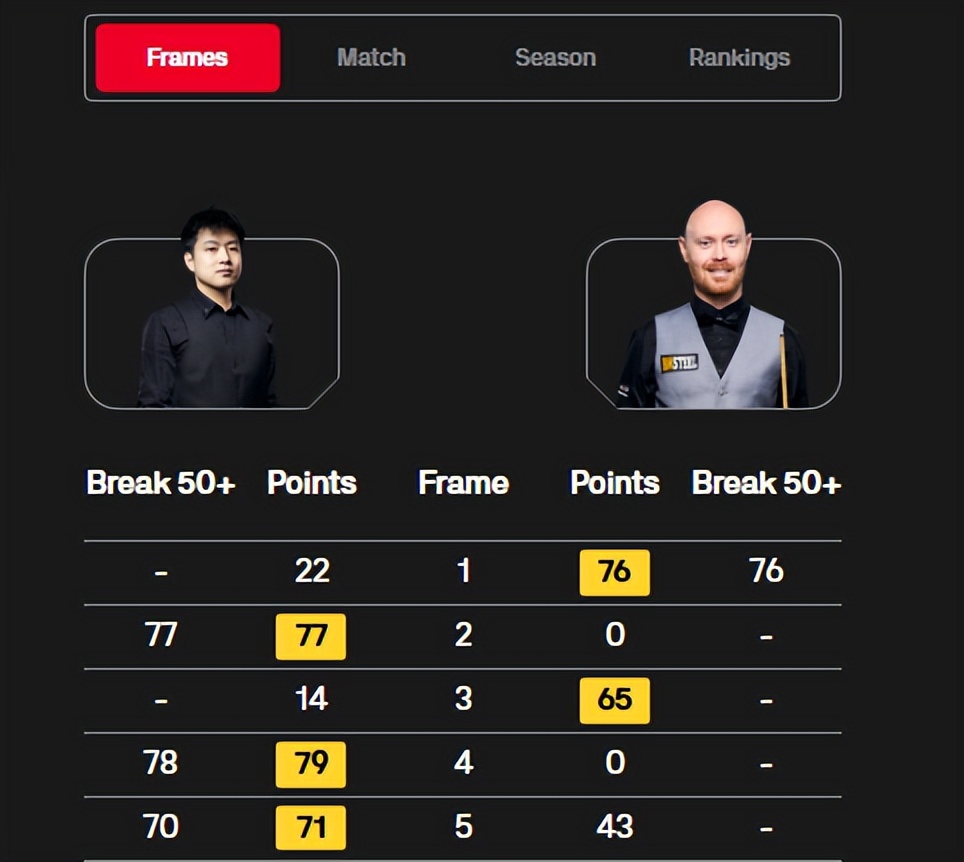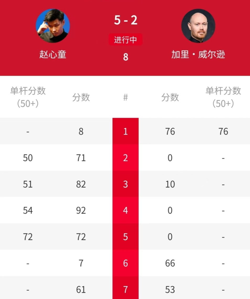 第五局,两人战绩激战,威尔逊通过零敲碎打得到43分,赵心童则又打出单杆70分,71-43锁定胜局,总比分3-2逆转加里-威尔逊。