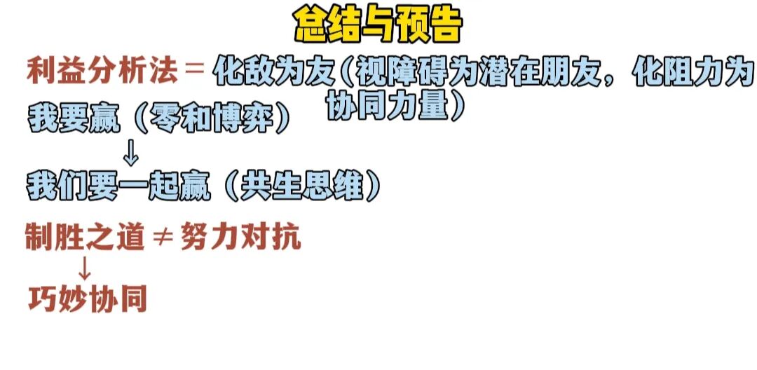 如果各位能够看到这里,能看出利益分析法是一种化敌为友的智慧,它教会我们思维上的转变,就是从“我要赢”的零和博弈转向“我们要一起赢”的共生思维。