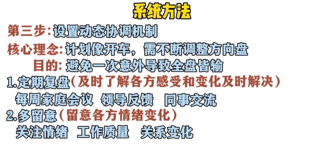我们要做的有三点,第一个定期复盘,目的是及时了解各方感受和变化,保持开放沟通,小问题及时解决,将潜在的新问题扼杀在摇篮中,别等闹大了再处理,比如每周和妻子家庭会议,和领导展示一下学的技能成果看看反馈,和同事分享一些非核心的东西,交流交流,维持关系;然后是第二步要多留意,留意妻子情绪变化,真要哪天开始抱怨增加,我们就要调整计划先以家庭为主了,如果最近工作质量下降也要调整一下计划节奏,以上和同事聊聊还能聊一些,最近几次你发现他明显不想聊了或直接疏远,以上这些出现很可能关系出问题了,你就要及时沟通调整;