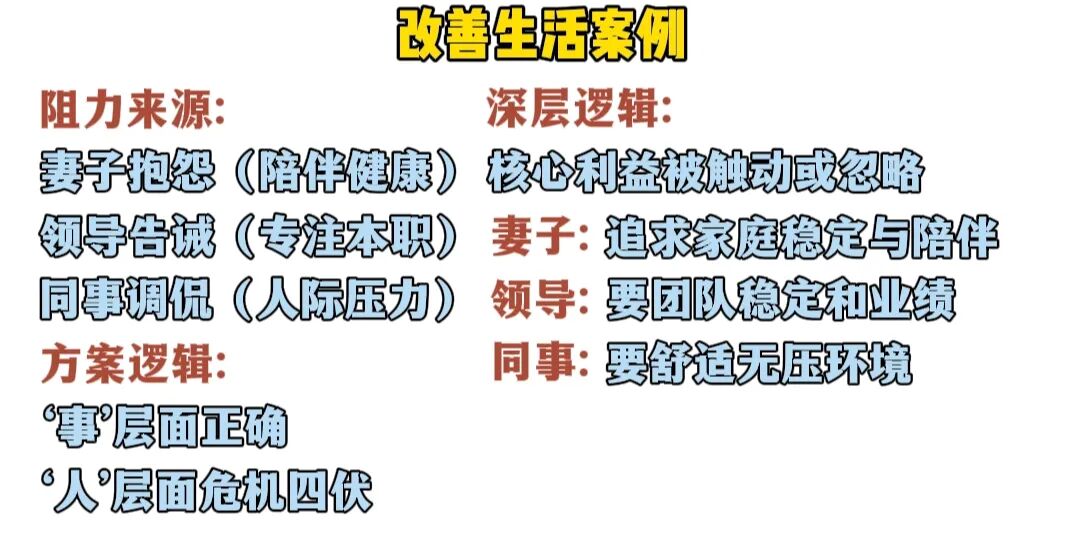 并不是,这些看似个人情绪的背后隐藏着更深层的共通逻辑——就是你的计划触动或忽略了他们的核心利益了,很简单的道理,妻子追求的是丈夫陪伴家庭稳定,领导需要的是团队稳定和业绩提升,同事想要的是舒适且没压力的工作环境,再直白点说就是怕你富嫌你穷的心理。