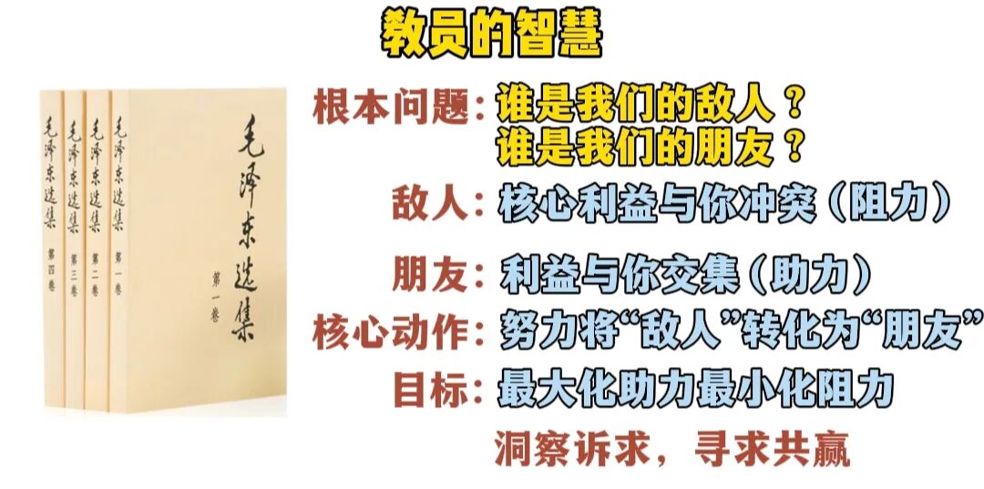 这里面的敌人不是你们理解的那种,是我们上面所说的核心利益和你的核心目标起冲突或要是冲突的人,主要阻力来源;朋友是他的利益和你存在交集、可以协同的人或者是具有直接或潜在助力来源的人,我们要做的是啥,看清分清这种关系,努力将“敌人”转化为“朋友”,最大化助力、最小化阻力。