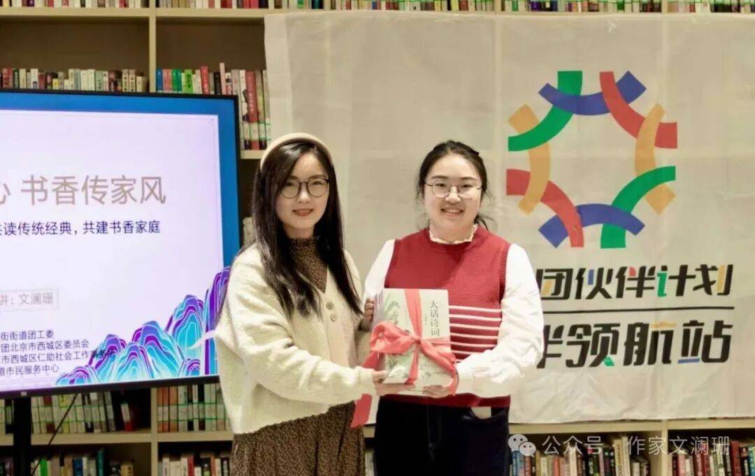 作家文澜珊向金融街街道赠送了自己的文学作品《大话诗词》,金融街街道团工委书记丁玲接收了捐赠。