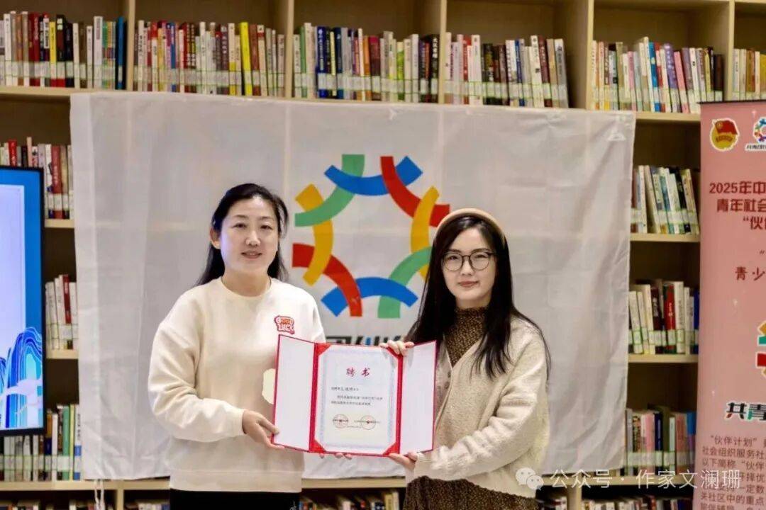 活动中,手帕社区党委书记毕晋向文澜珊颁发了“伙伴计划”伙伴领航站“青年文学文化宣讲导师”聘书。
