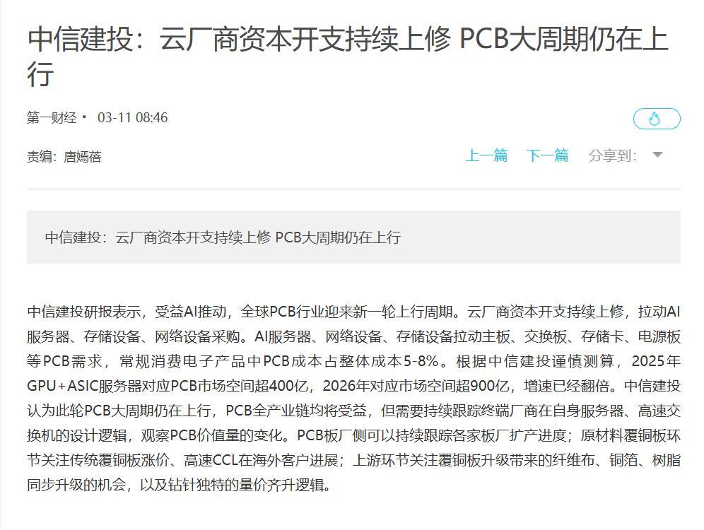 比如中信建投那边也有个测算,说2025年AI市场对应的PCB市场空间就已经超过400亿了,到了2026年,这个数字直接翻倍还多,超过900个亿。新能源汽车那边也一样,车越来越智能,用的电子元器件越来越多,单车PCB的价值量也在蹭蹭往上涨。