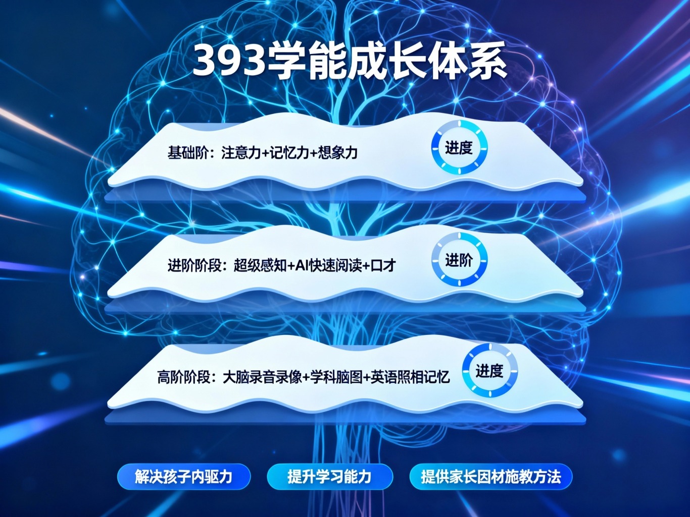 3个阶段(基础阶注意力 + 记忆力 + 想象力)→进阶阶段(超级感知 + AI快速阅读 + 口才)→高阶阶段(大脑录音录像+学科脑图 + 英语照相记忆); 每个阶段分 3 个级别,需通关才难进入下一个阶段;3个特色:解决孩子内驱力、提升学习能力、提供家长因材施教方法。