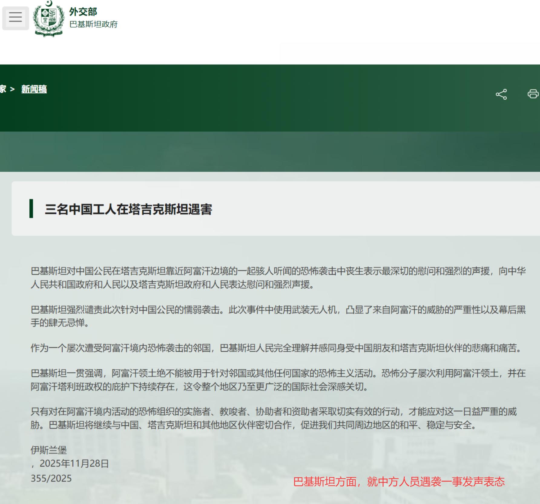 从法新社报道来看,塔吉克斯坦当局11月27日透露,这三名在塔吉克斯坦边境地区工作的中国工人,是因为遭遇到一场从阿富汗境内发动的袭击而遇害的。而塔吉克斯坦与阿富汗塔利班的关系长期以来都比较紧张,甚至近几个月来,两国边境地区多次爆发冲突。