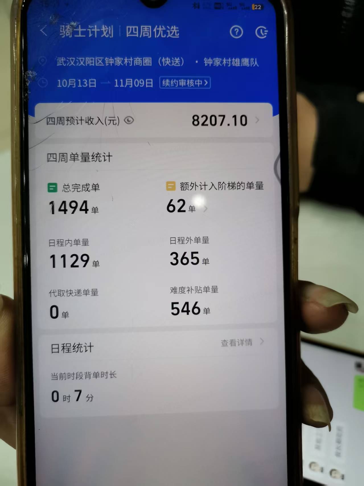 11月5日14时,长江日报记者见到成龙时,他有一笔订单因为商家出餐慢导致后续多个订单被系统判定为超时。平台规则是超时5分钟内免罚,但他担心影响后续接单。队友替他拨打平台客服电话讲明原因,平台核实后对超时订单免予处罚。