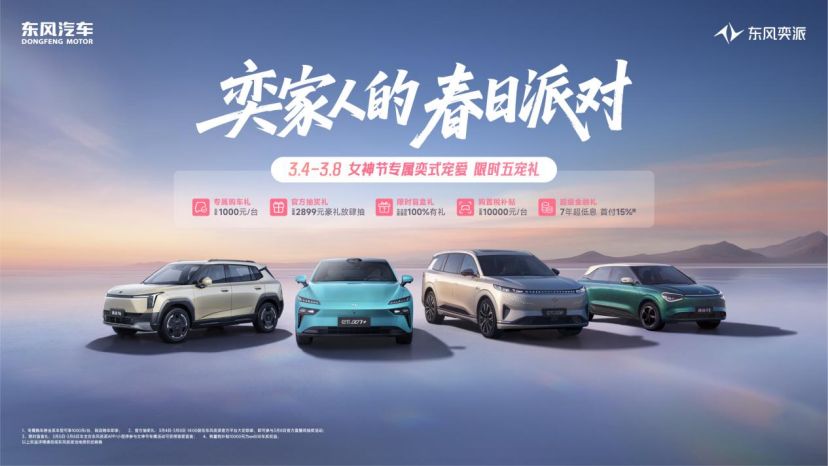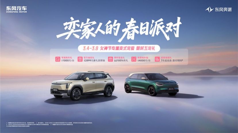 时值女神节,东风奕派倾情开启“奕家人的春日派对”,并为用户推出女神节专属奕式宠爱“限时五宠礼”,以至高10000元/台购置税补贴,7年超低息+首付15%超级金融礼,1000元/台专属购车礼,100%有礼限时盲盒礼,至高2899元的官方抽奖礼等,助力女性用户轻松购车、无忧用车,尽情享受多姿多彩生活。