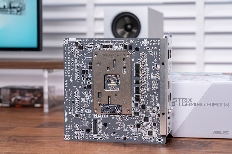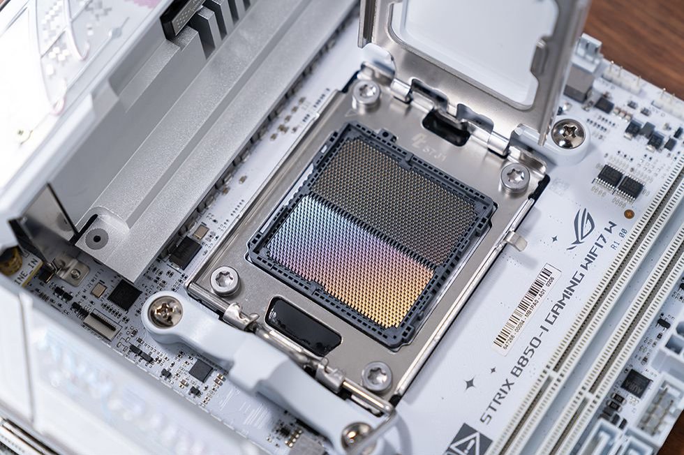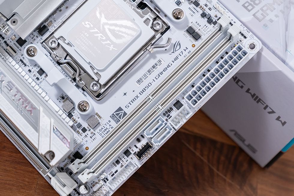ROG STRIX B850-I GAMING WiFi7 W 主板采用 AMD 最新的 AM5 接口,全面兼容锐龙 7000/8000/9000 系列处理器,支持 PCIe 5.0 与 DDR5 内存生态,官方承诺未来将通过 BIOS 更新支持更多新一代处理器。CPU 插槽周围做了强化防护设计,金属卡扣质感扎实,插拔处理器时阻尼适中,有效避免针脚损坏。接口下方预留充足散热空间,适配各类迷你主机散热方案。