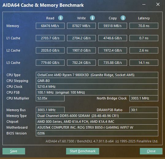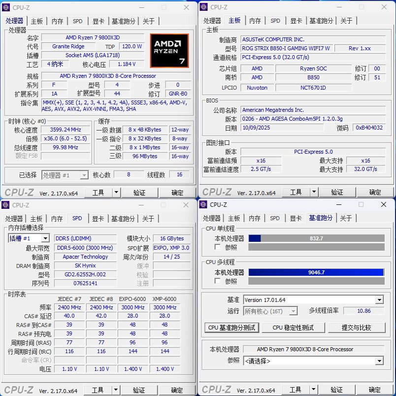 为全面评估ROG STRIX B850-I GAMING WiFi7 W 主板的实际性能表现,本次测试采用主流配置方案:处理器选用AMD Ryzen 7 9800X3D旗舰型号,显卡为 索泰 RTX 5070Ti专业显卡,系统内存采用双通道架构,由两条16GB容量DDR5 6000MT/s高频内存组成,存储设备搭载PCIe 5.0协议NVMe固态硬盘,操作系统环境为Windows 11专业版,BIOS开启PBO。该测试平台配置符合当前主流高性能计算标准,可有效验证主板各项功能指标的实际效能。