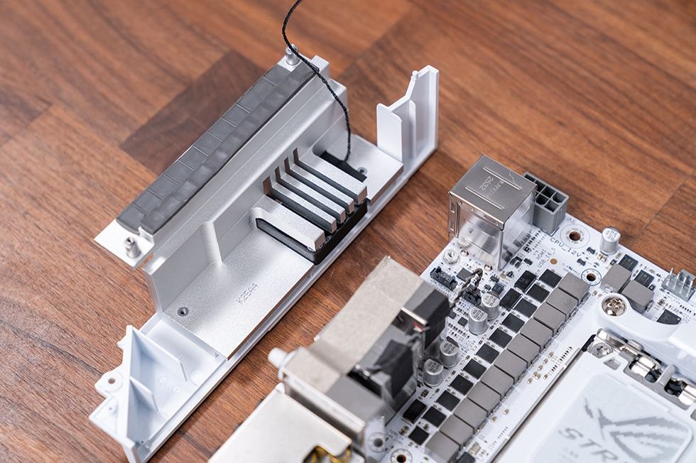 ROG STRIX B850-I GAMING WiFi7 W 主板的散热系统采用 “三维热流” 设计:VRM 区域覆盖大面积寒霜散热装甲,内部采用多层沟槽结构增大散热面积;装甲与供电模块接触面敷有 7W/mK 高导热系数导热垫,配合背部导热贴与 10 层低损耗 PCB,形成高效散热通道。VRM 散热片延伸到后侧 I/O 实现充足的散热面积,并提供主动式散热的 VRM 风扇,能够巧妙地处理最新 AMD 处理器的电源热量,同时为大尺寸 CPU 散热器预留空间。