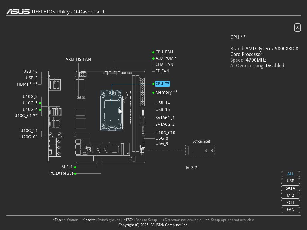 值得一提的是,在BIOS中的Q-Dashboard界面中可以看到主板的缩略线框图,以及主板各个接口/插槽的使用情况,已使用已安装设备的接口或者插槽会显示为绿色,方便使用者可以清晰直观的看到主板上所连接的全部设备和外设情况。