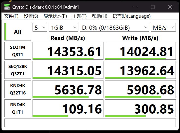 在存储性能专项测试环节,针对这款 PCIe 5.0 规格固态硬盘,采用 CrystalDiskMark 基准测试性能验证。测试数据显示,该硬盘顺序读取速度达到14353.614 MB/s,顺序写入速度达14024.81MB/s,这一成绩已十分接近其官方标称的理论极限性能。充分挖掘了 PCIe 5.0 接口的高带宽潜力,展现出旗舰级存储硬件的性能优势。