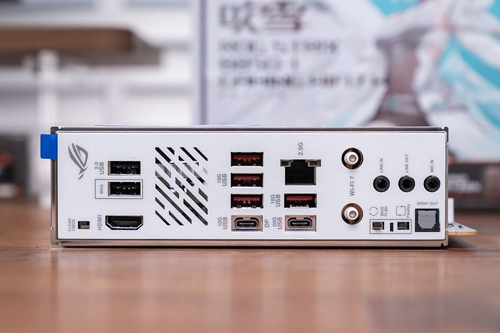 背部为一体化的I/O面板,提供1个HDMI 2.1接口,2个USB 2.0,1个USB 3.2 Gen2x2 Type-C,5个USB 3.2 Gen2(其中4个Type-A ,1个USB Type-C with DP Alt mode),1个2.5Gbps 有线LAN,双天线无线网卡天线接线端,一个Clear CMOS按钮,一个BIOS FlashBack按钮,以及3个3.5mm+1个S/PDIF光纤输出的音频接口组。