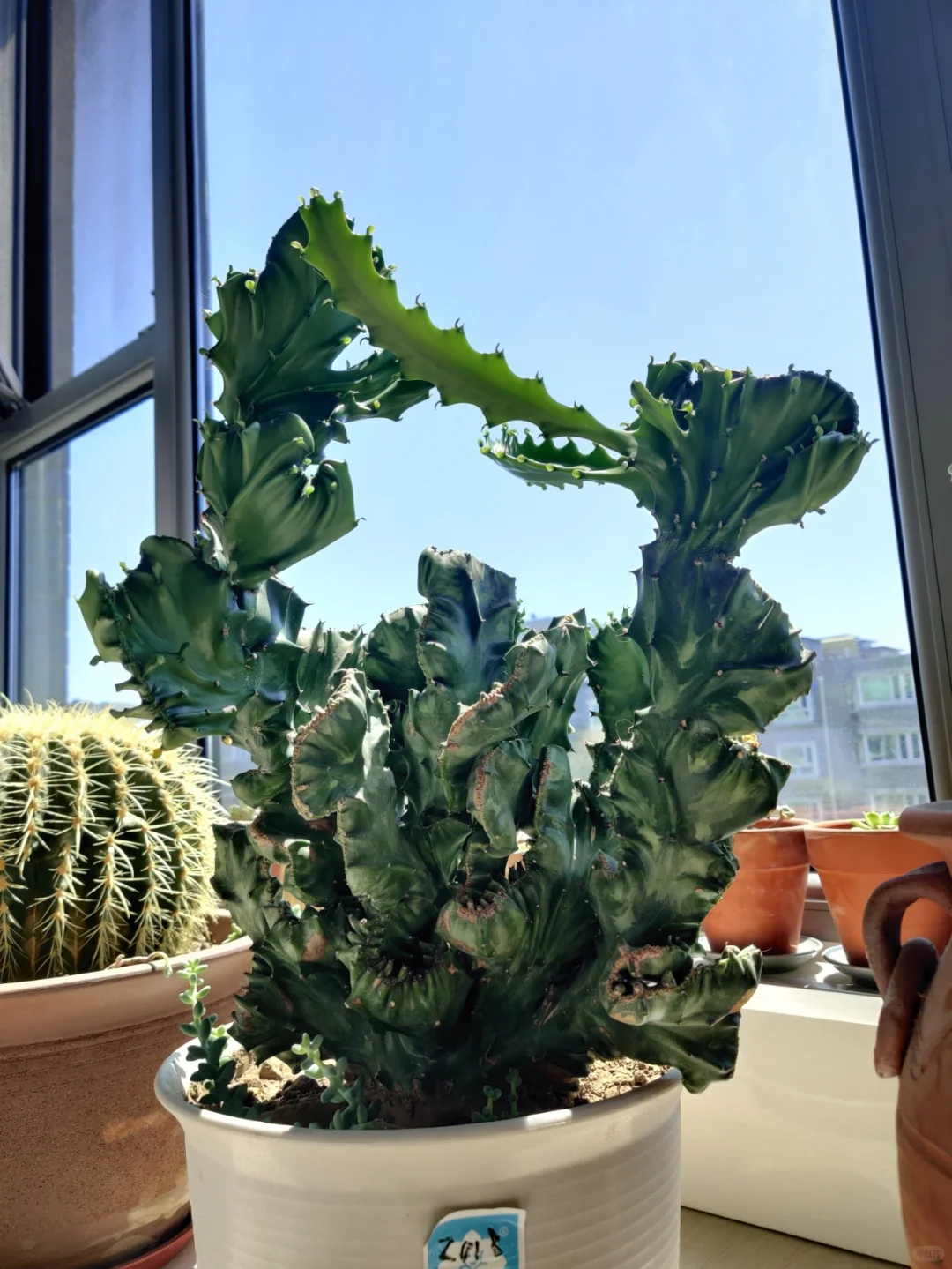 又名:虎刺梅、麒麟角、玉麒麟,象征着“安定温暖”,外形霸气,花期长,为此,一直是很多人喜欢的镇宅花。