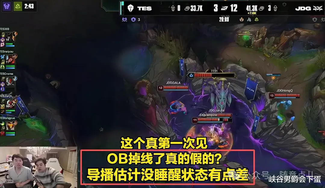 作为春节过后的第一场B05,再加上JDG战队与TES战队名气也很高,所以观看这场比赛的观众还是很多的,然而直播中却出现了这种事故,导致扫了很多观众的兴,甚至有观众认为是在放录像。正在直播讲解比赛的姿态和教练朱开也看懵了,直言:“太变态了,这个真第一次见,OB掉线了真的假的啊?导播估计没睡醒,状态有点差。”