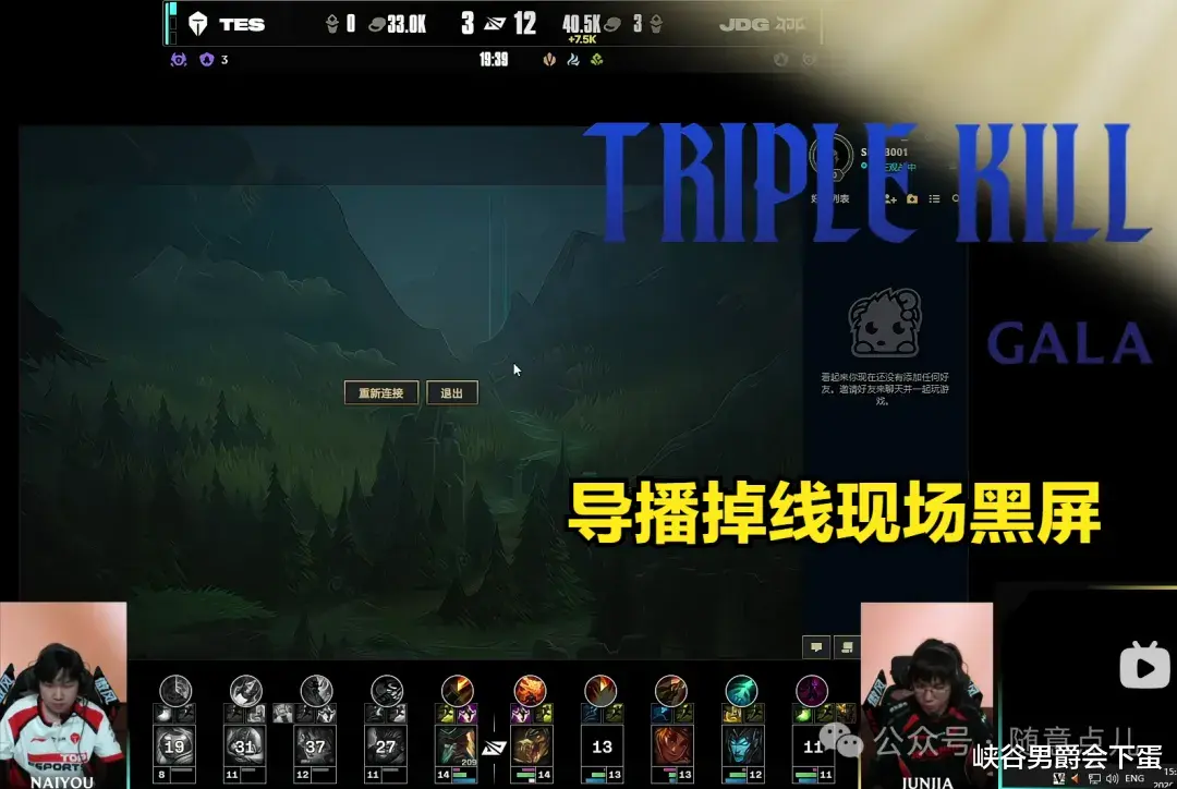 可能是刚刚经历了长时间的休赛,选手们的状态尚未完全恢复,导致在这两场BO5中频繁出现一些奇怪的操作,所以观众们也有所体谅。而在JDG战队与TES战队的第二局比赛期间,也发生了一件令人出乎意料的事情,那就是比赛进行到了19分34秒的时候,此时正在发生小规模的团战,画面突然黑屏并且退出客户端,经过了5秒才恢复正常,在这期间线上所有观众只能听解说讲解的声音而没有画面。