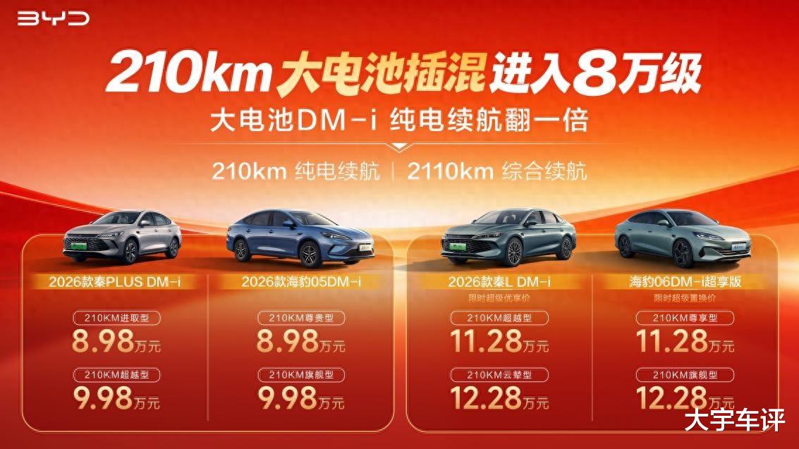 2026年元旦刚过,比亚迪正式开启了“大电池插混”时代,插混电力再加码,旗下4款热销插混轿车正式加推大电池DM-i,CLTC纯电续航均达210km,综合续航超2110km。其中,A级插混家轿2026款秦PLUS DM-i、2026款海豹05DM-i各加推2个版本,官方指导价8.98-9.98万元,重新定义8万级混动车型价值"天花板";中级插混轿车2026款秦L DM-i、海豹06DM-i超享版也各加推2个版本,官方指导价11.68-12.68万元,秦L DM-i限时超级优享价、海豹06DM-i限时超级置换价11.28-12.28万元,全面树立中型插混家轿市场新价值标杆。