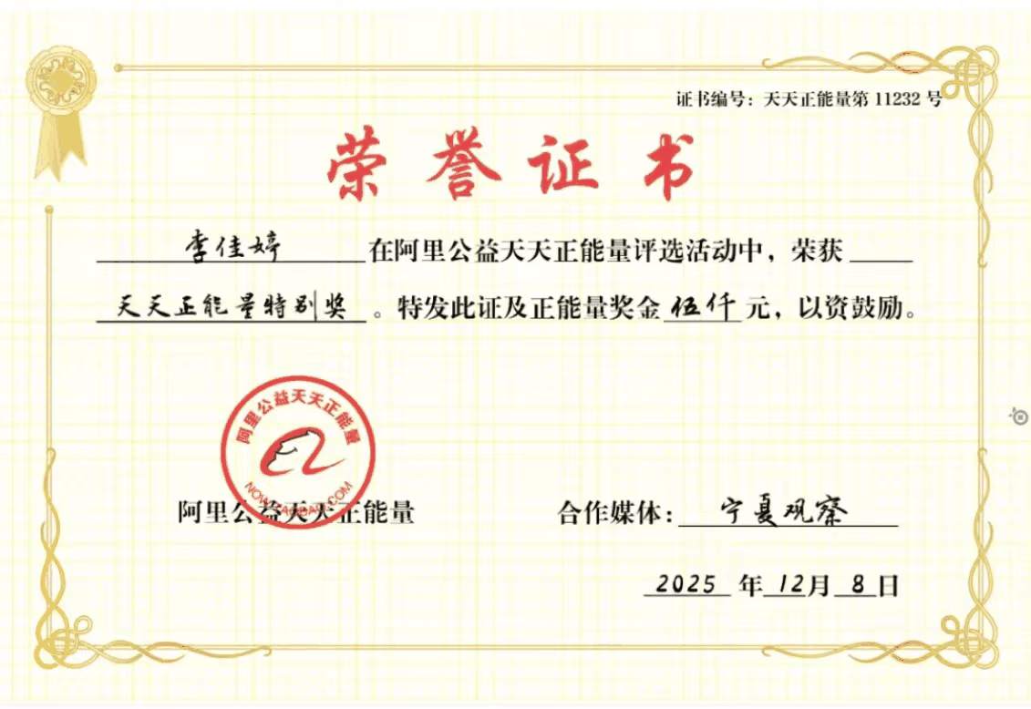 阿里公益“天天正能量”联合宁夏观察还为李佳婷颁发了“天天正能量特别奖”及5000元奖金,以表彰她的勇敢和善良。