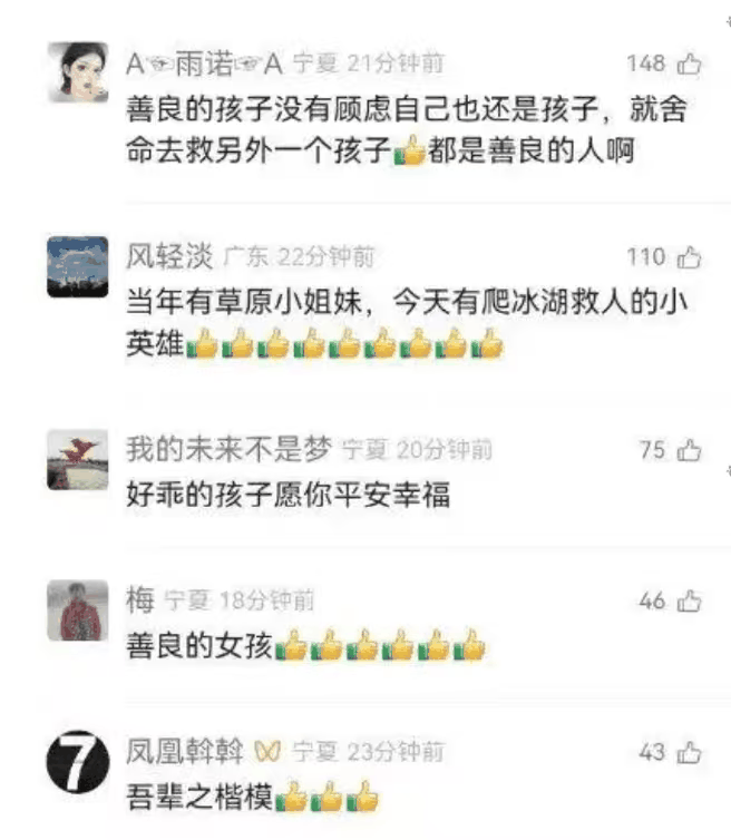 12月6日下午,在宁夏吴忠市同心县豫海湖,一名4岁男童不慎坠入冰窟。危急时刻,13岁的同心县第二中学初一女生李佳婷挺身而出,主动表示“我身体轻,我下去救!”,并接过路人递来的塑料管,爬向冰窟将管子递给男童。在救援过程中,冰面突然破裂,李佳婷也坠入冰水,但她始终紧握管子不松手,直到消防员与群众合力将她和男童救上岸。