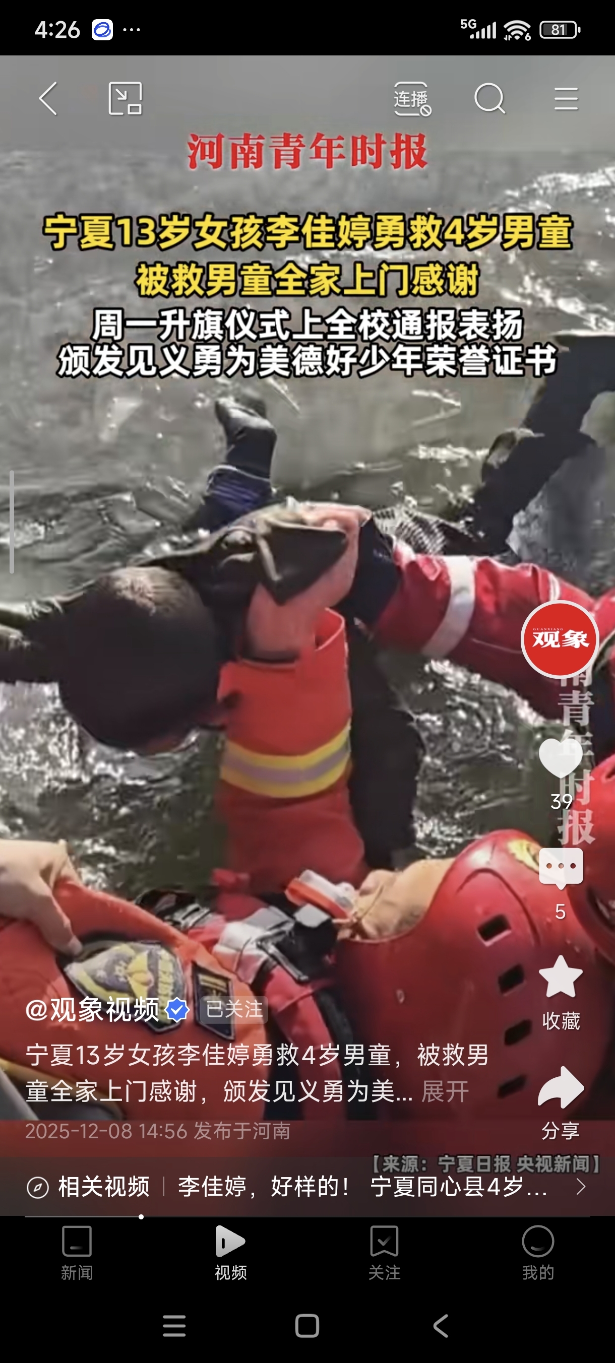 宁夏13岁女孩李佳婷勇救4岁落水男童,被男童全家上门感谢!周一升旗仪式上,全校通报表扬,还颁发了见义勇为美德好少年的荣誉证书,还被阿里公益天天正能量联合宁夏观察评为天天正能量特别奖,奖金5000元。李佳婷说:“救人的时候,我没有想那么多,当时只想着把小弟弟救上来,看着消防员叔叔把小弟弟救上来后,我就悄悄离开了,以后遇到别人需要帮助的事情,我还会去帮助”,她的善举引发了全国网友和媒体广泛赞誉,大家称赞她“勇敢无畏、人美心善”!