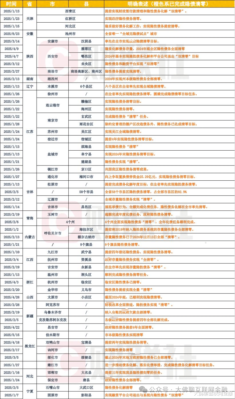 2025年中旬财联社就曾做过统计,截止到2025年6月30日,当时就有63地完成全域隐债清零。