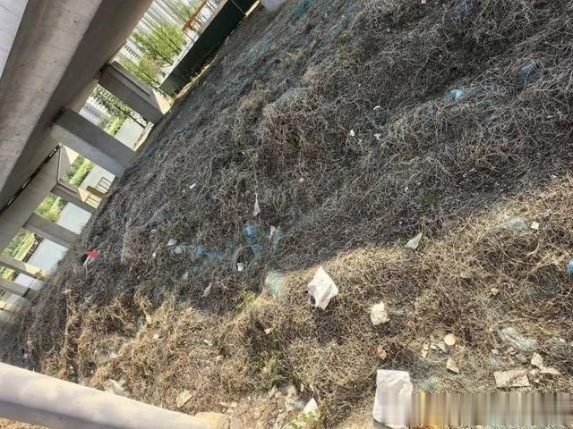 周边的杂草中夹杂着各种废弃物,塑料袋、碎砖块等散落各处,环境显得脏乱不堪。不仅破坏了整体的美观,还可能滋生细菌、招引蚊虫,对周边生态环境和居民健康都存在潜在威胁。
