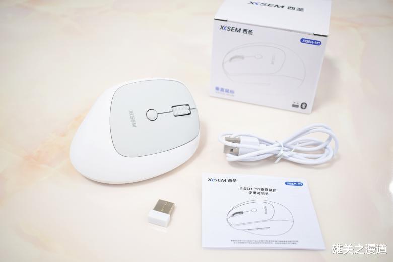 西圣M1无线蓝牙垂直鼠标的包装非常简洁,内部的配置也比较简单,鼠标主体,适配器,数据线,以及一份说明书。