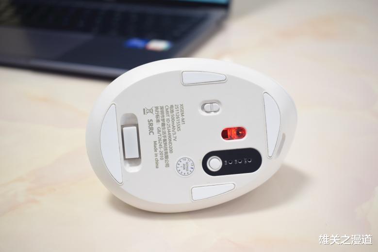 在底部设计了电源开关键、对码键、2.4G接收器(隐藏式收纳仓)和工作指示灯,4条高耐磨静音防滑脚垫降低了摩擦噪音。西圣M1无线蓝牙垂直鼠标能提供双蓝牙+2.4G三模连接,支持2个蓝牙设备加1个2.4G无线接收器同时配对,可在电脑/平板/手机等3台设备间灵活切换,无需反复重新配对,兼容多种操作系统,无需安装额外的驱动程序,即插即用,非常方便。蓝牙连接最大距离8米,2.4G接收器最大距离10米,能覆盖各种日常使用场景。