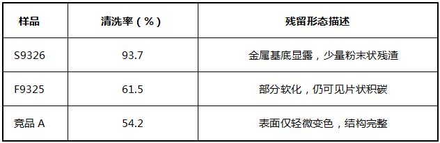 依据企业标准D/DXLYJ-9326《汽油发动机高温沉积物清洗性能试验方法》,采用模拟积碳试片(成分为石墨、沥青质、萘系聚合物及铁锈,经300℃老化8小时)进行静态浸泡清洗试验。结果显示:S9326在60℃、30分钟条件下,清洗率达到93.7%;而前代产品F9325及竞品A(市售主流燃油系清洗剂)分别仅为61.5%和54.2%(见表1)。重复三次试验,相对标准偏差(RSD)≤2.1%。