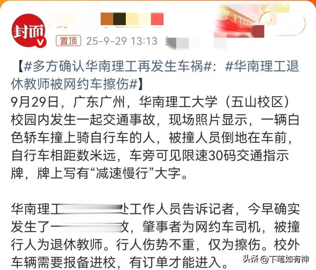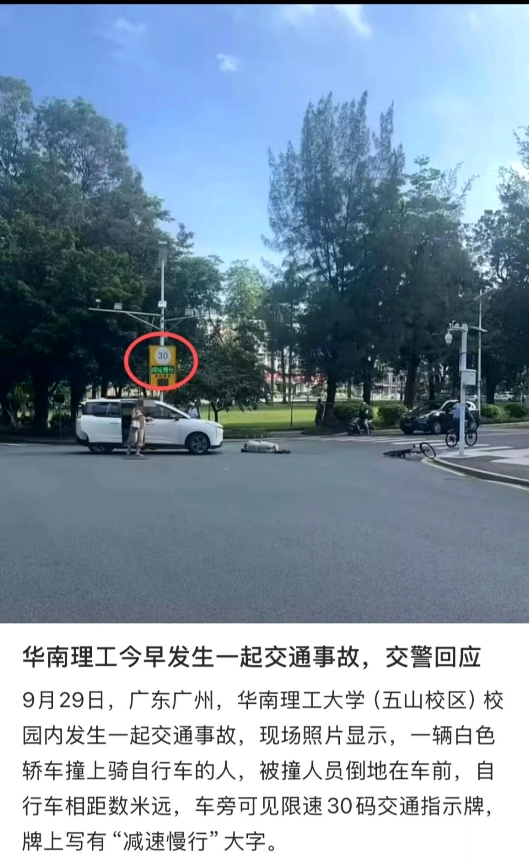 据封面新闻报道,9月29日,华南理工大学内发生一起交通事故,一辆白色轿车撞上骑自行车的人。