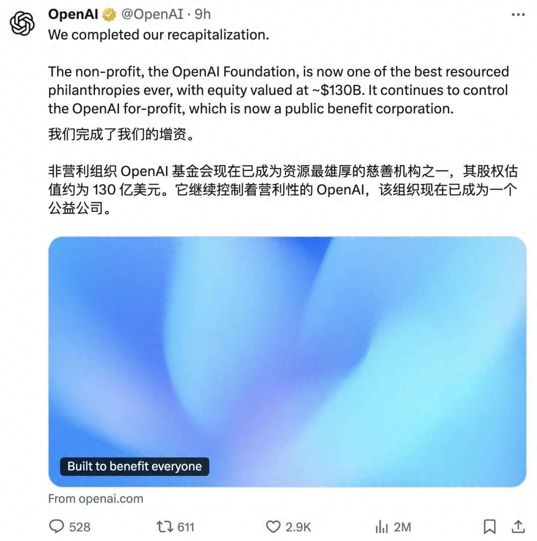 就在昨晚,OpenAI 宣布完成资本重组,并简化公司结构。