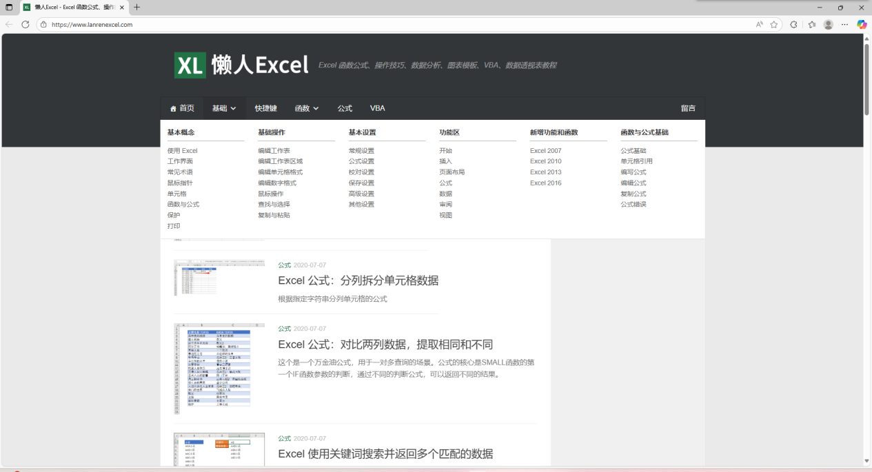 9、懒人excel这是一个让你快速精通excel技能的教程网站。网站从最基础的教程开始,一步一步的学习快捷键、函数公式等等。不管是从哪个阶段都能快速学会,并且用具体的案例和步骤演示来学习掌握实用技能,网站内容简单明了,不需要登录,没有广告,点开就能查看详细教程和公式,如果想提升excel办公效率,就抓紧打开学习吧。