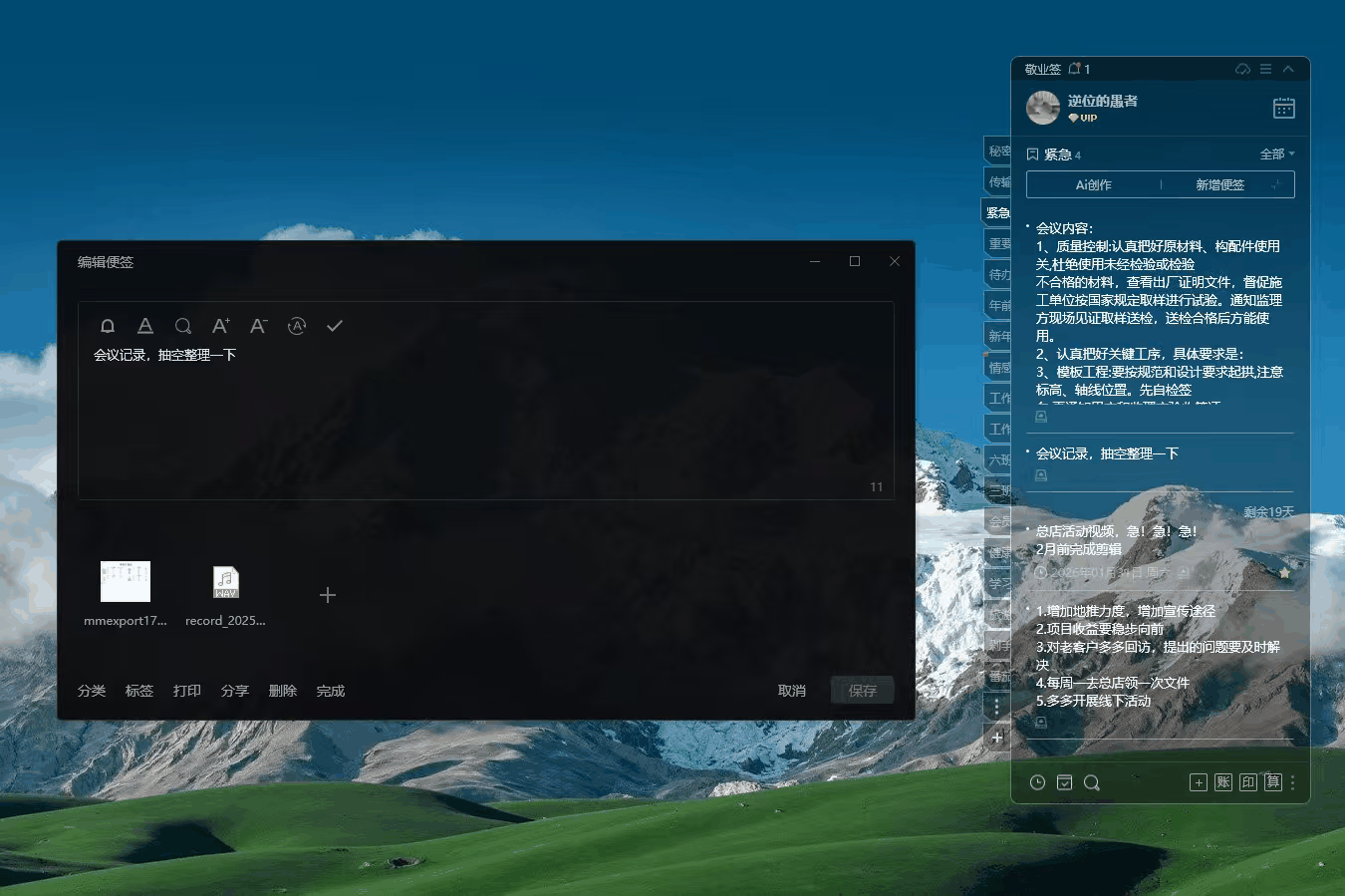 在桌面适配之外,敬业签又有一套强大的功能内核支撑着它的实际体验。它的便签记录能力强,一般的文字信息可以记,图片视频文档等文件也能上传到附件上,附件支持拖拽上传非常方便。而且便签记录框直接快捷键就能呼出,让你随时都能立即进入记录状态。