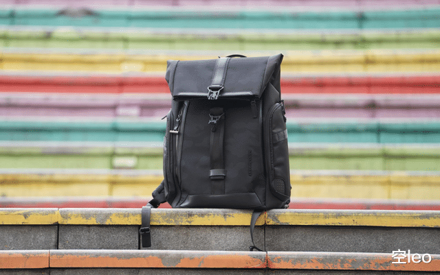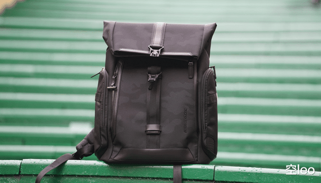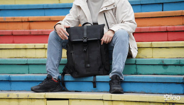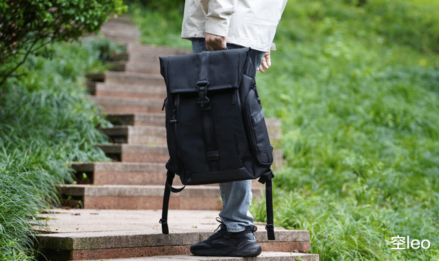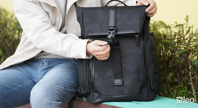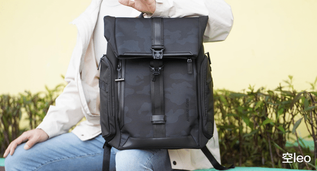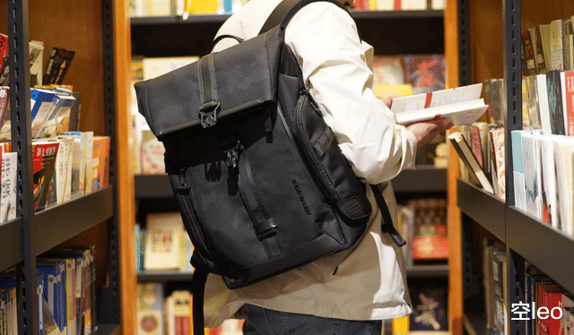 正面采用了三层暗纹迷彩防水面料——这个设计非常克制,暗光下近乎全黑,光线打上去才会浮现出精致的纹理。搭配半卷口设计,不仅增加了辨识度,视觉层次感也比传统拉链包丰富得多。无论是商务洽谈还是日常通勤,背上它都不会有违和感。