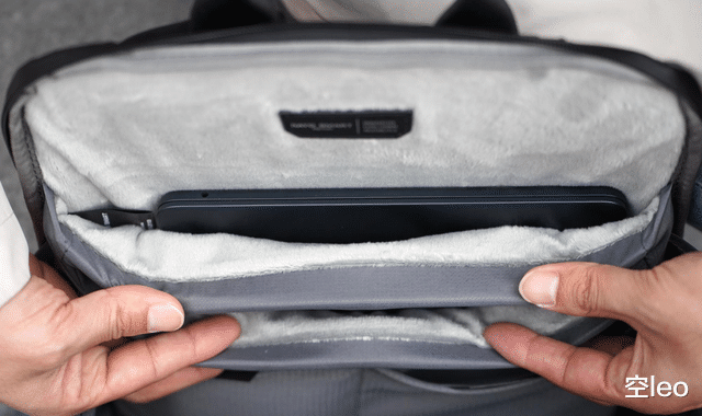 独立数码仓绝对是灵魂设计。内衬采用了定制的水晶超柔绒,摸上去像云朵一样细腻,能有效防止笔记本和iPad之间的摩擦剐蹭。底部还有加厚的防撞条,就算不小心把包放在地上也不用担心磕到电脑。16寸笔记本放进去绰绰有余。