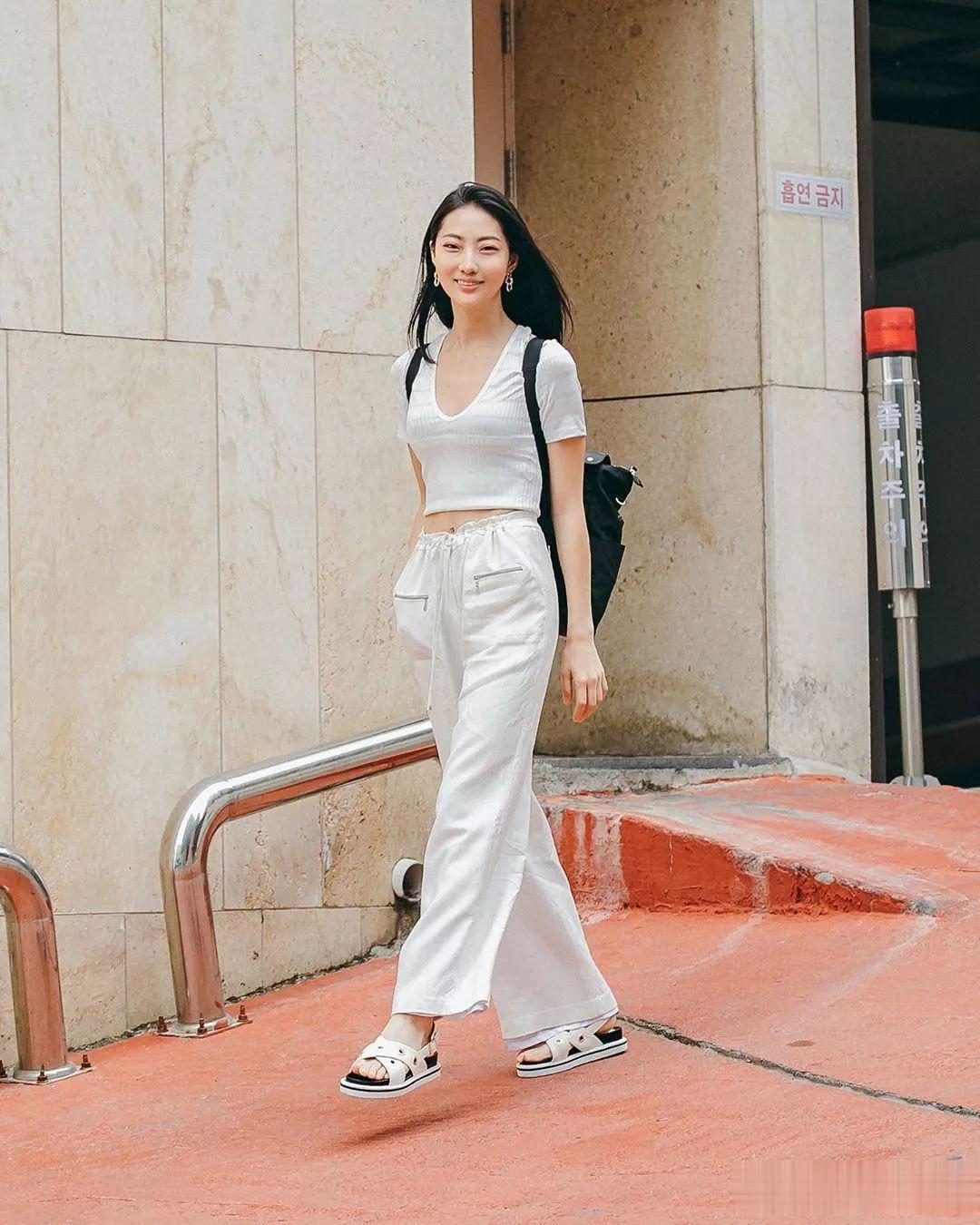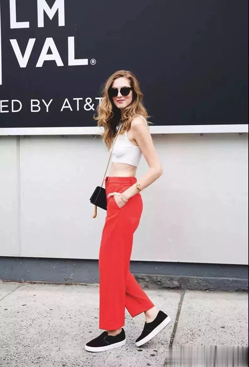 短款T恤自带高腰线,搭配高腰裤装,完全不用考虑搭什么就很出彩。腰线位于肚脐上方或者肋骨最细的地方效果最佳,可以瞬间拉长腿部比例,展示上短下长的三七分身形。