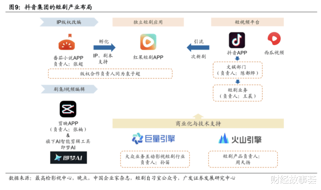 产业链的下游是“巨量引擎”,国内短剧最主要的投流渠道。巨量引擎整合了字节跳动旗下的海量营销资源,结合算法模型、智能分发以及火山引擎云服务优势,为红果短剧提供充足的商业化资源以及买量环节的降本增效。