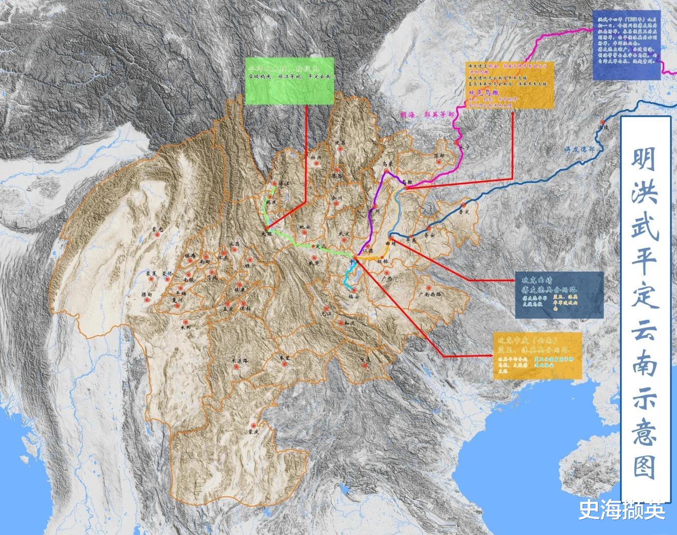 傅友德、蓝玉、沐英三将军师出金陵,军势浩大,蔽江而上。洪武十四年(1381年)九月,三十万征滇大军齐集湖广,傅友德按照朱元璋指授方略,命都督郭英、胡海洋、陈桓率兵5万由四川永宁直取乌撒,沿途几乎兵不血刃,苗族等少数民族闻风归附。当年十二月,拿下了普安,旋即进兵曲靖,歼灭梁王势力。
