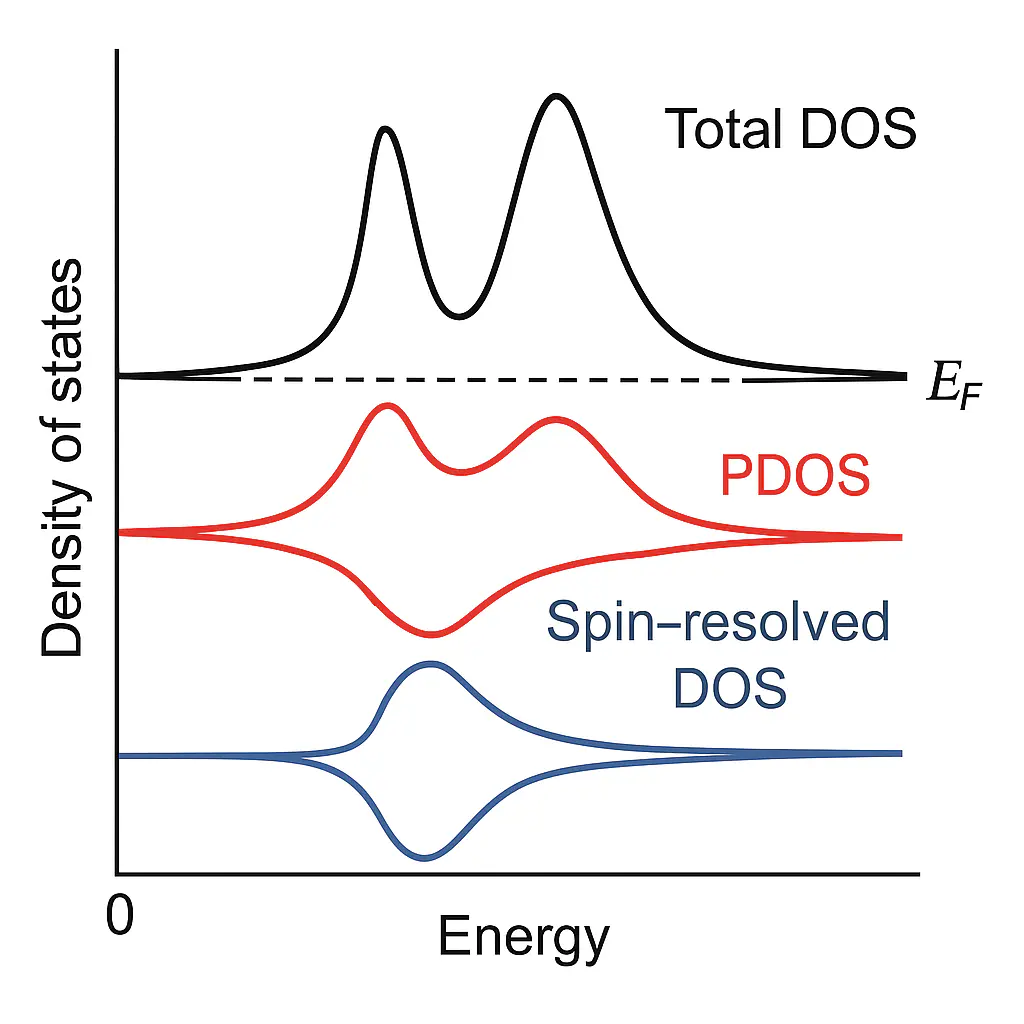此外,研究者常使用投影态密度(PDOS)和局域态密度(LDOS)进行深入分析,分别揭示特定原子、轨道类型或空间区域的贡献。