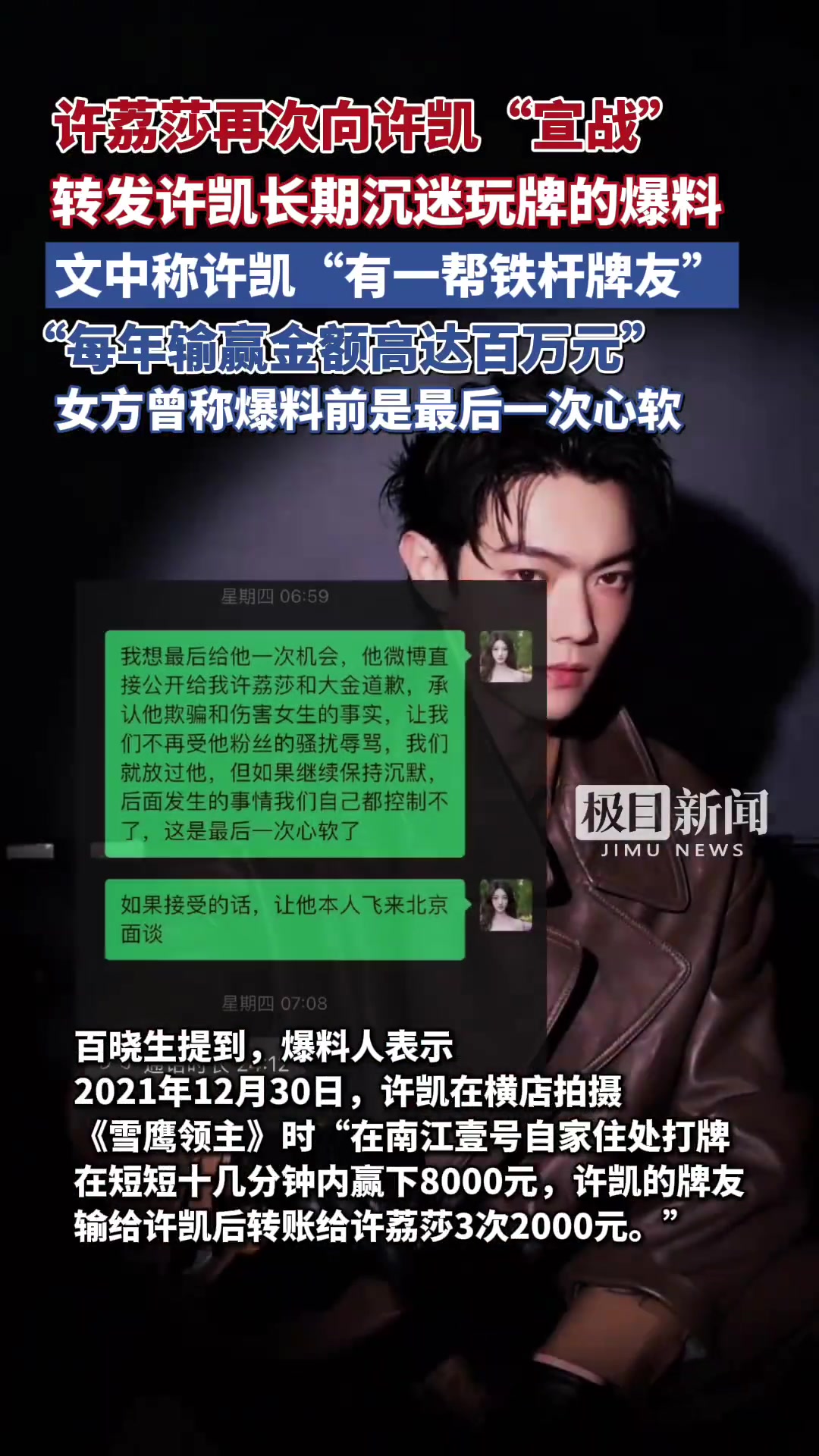 横店豪宅变成牌场,单次输赢数万元,说真的,我之前还蛮喜欢许凯演的富察傅恒的,没想到戏外竟然这么离谱。据“会拍摄的百晓生”爆料,许凯在横店有个固定牌友圈,长期聚众赌博,每次输赢几万不等,一年下来金额高达百万,他在横店的豪宅直接被戏称为“私人赌场”,自个儿也从“横店小王子”升级成了“牌场大帝”,这升级路线也是没谁了!最绝的是,爆料里还有实打实的证据:2021年12月30日,许凯在横店拍摄《雪鹰领主》时,在自家住处打牌,短短十几分钟就赢了8000元,牌友分三次转账给当时许凯的女友许荔莎6000元,还有2000元被退回,聊天记录里还有人叮嘱许荔莎“务必保密”,说“这个圈子很小”,这不典型的明知故犯吗?