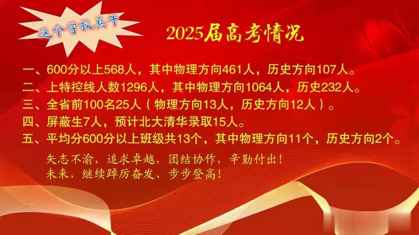 南白中学2025年高考600分以上568人,清北录取12人,其中北京大学6人,清华大学6人,香港中文大学1人,国防科技大学10人。