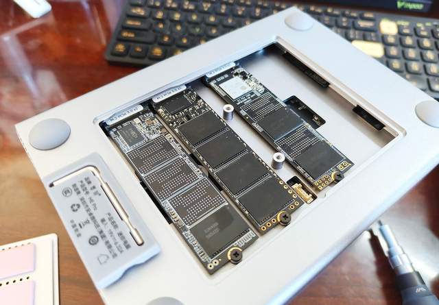 隐藏在硅胶垫后面的是两颗螺丝,用小扳手就可以拆开,原来底部的这个盖子是可以打开的,而里面则又是三个SSD的盘位。零刻ME Pro有两个版本,准系统版本是没有硬盘的,也没有系统;而128GB版本则直接带有了一条SSD,里面已经预装了飞牛的商业版。