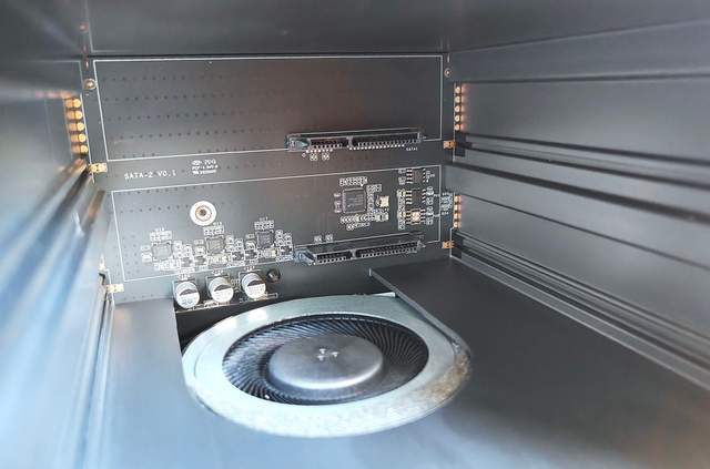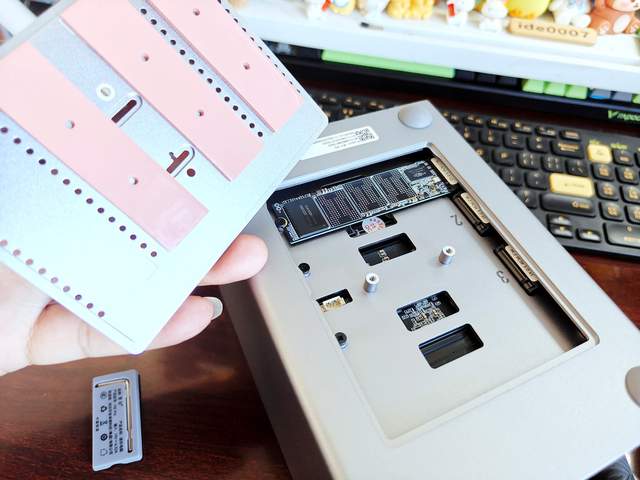零刻ME Pro支持扩展两块硬盘,兼容3.5英寸和2.5英寸的SATA硬盘。抽屉上自带了散热片,确保硬盘运行的稳定性。
