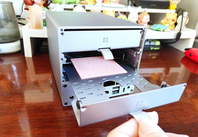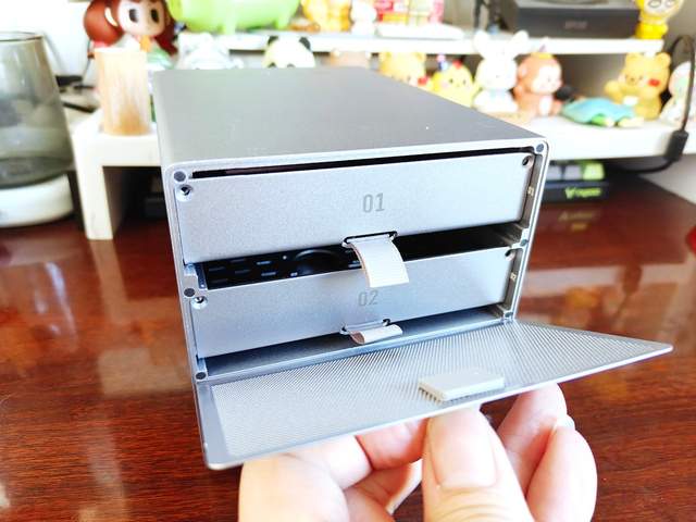 这个磁吸散热网打开就能看到两个盘位抽屉,采用了抽拉设计,通过螺丝固定,直接拉出就能打开。