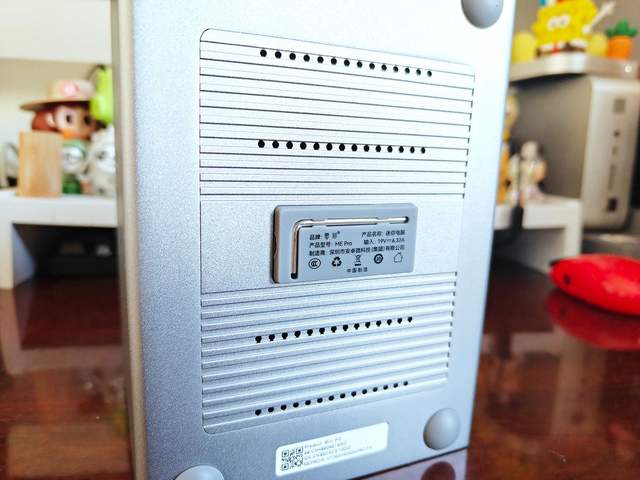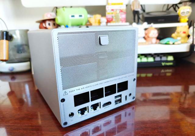 零刻ME Pro的背面上半部分是一个可以打开的磁吸散热网,底部是四个大大的散热孔,整体机器的前后散热都做到了极致。最下方一排才是接口,左边是DC电源口,然后是两个网线接口,零刻ME Pro支持2.5GE和5GE双网口,速度非常快。还有个HDMI接口,可连接显示器,然后就是两个USB接口和一个C口了,最右边还有个耳机接口,可以说非常的全面。
